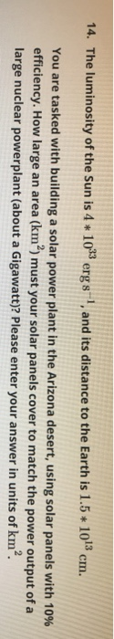 Suns Surface Area 609421 x 10²² square centimeters. The luminosity of the Sun is 3846 10 26 watts or 3846 10 33 ergs per second. You are tasked with building a solar power plant in the Arizona desert using solar panels with 10 efficiency.